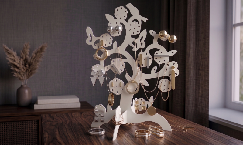 Tento stylový organizér ve tvaru rozkvetlého stromu s ptáčky a motýly je ideálním spojením designu a praktičnosti. Slouží k přehlednému zavěšení náušnic, řetízků i náramků. Díky čistému bílému provedení se hodí do každého interiéru, od moderních ložnic až po romantické toaletní stolky.